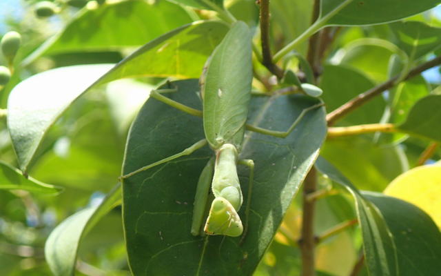 駐車場には、今時期に実をつけるトウネズミモチという木があります。ふと木を見上げてみたら、なんとハラビロカマキリが葉っぱにはりついていました!写真を撮ろうとカメラを近づけると、こちらに気付き、カメラに目線をくれました。カメラ越しではありますが、思わぬ形でカマキリと見つめ合うことになりました。(宮岸)