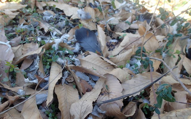 皆さんは冬の風物詩に何を思い浮かべますか?桑袋ビオトープ公園では「サンクチュアリに散らばるハトの羽」がその1つです。毎冬オオタカなどの猛禽類がハトを捕まえ、サンクチュアリでトドメを刺すのでこのような光景が見られます。12~3月頃しか見られないので、少し物騒ながらも冬を感じます。(増山)