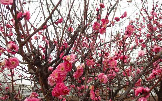 朝には池の水が凍り、寒空にヒヨドリの鳴き声が高く響く、冬も本番といった様子ですが、ウメは春の気配を告げるように甘い香りを漂わせています。花の香りに誘われて、メジロやミツバチがやってくることも。美しい花の開花を喜んでいるのは人だけではないみたいですね。(善如寺)