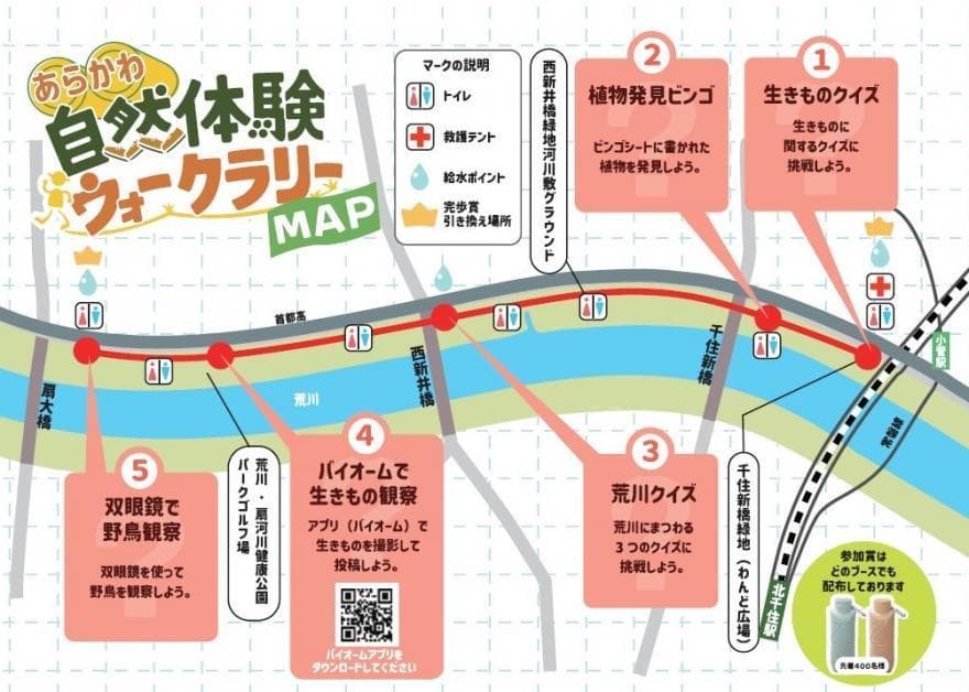 荒川河川敷左岸(荒川の北側のエリア)の「荒川千住新橋緑地(わんど広場)」付近から「扇大橋」付近の区間に設置した5つのブースを巡り、ミッションに取り組んでいただきます。