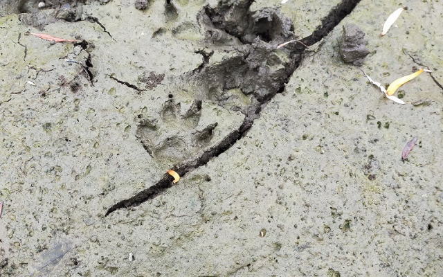 水が引いたハス田の泥の上に、足跡が残されていました。4本の指の先には爪のあともくっきりとみえます。この足跡を残したのは、タヌキ。公園内にタヌキのためふんがあるのですが(タヌキのトイレのような場所)、そこに来る個体のものでしょうか。池の水が引いたときは探してみてください。(阿部)