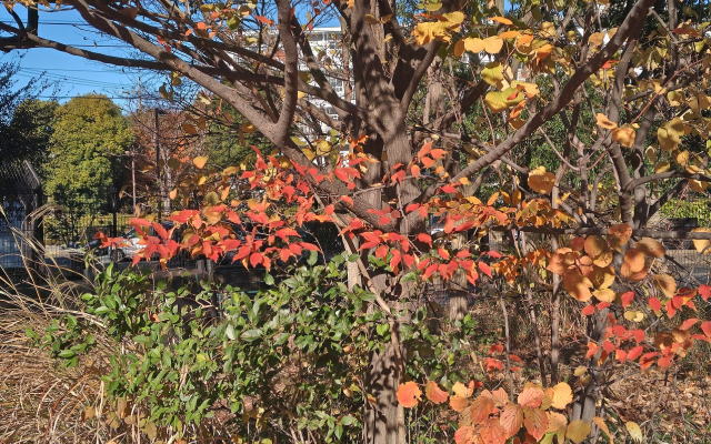 12月になり多くの樹が紅葉し、落葉している中、ハス田でアカシデの赤、ガマズミの黄、ネズミモチの緑とまるで信号機のように3色が重なっている場所を見つけました。皆さんも自然の中で今の季節のお気に入りの場所を見つけてみてください。(濱崎)