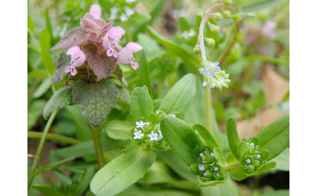 暖かい日が続き、足元では春の野草が花を咲かせ、小さな花畑が見られ始めました!1枚写真を撮るだけでも、ホトケノザ(左上)、キュウリグサ(右上)、ノヂシャ(中央)といった様々な野草の花が写ります。満開のサクラを見上げた後は、ぜひ足元の花にも目を向けてみてください。(宮岸)