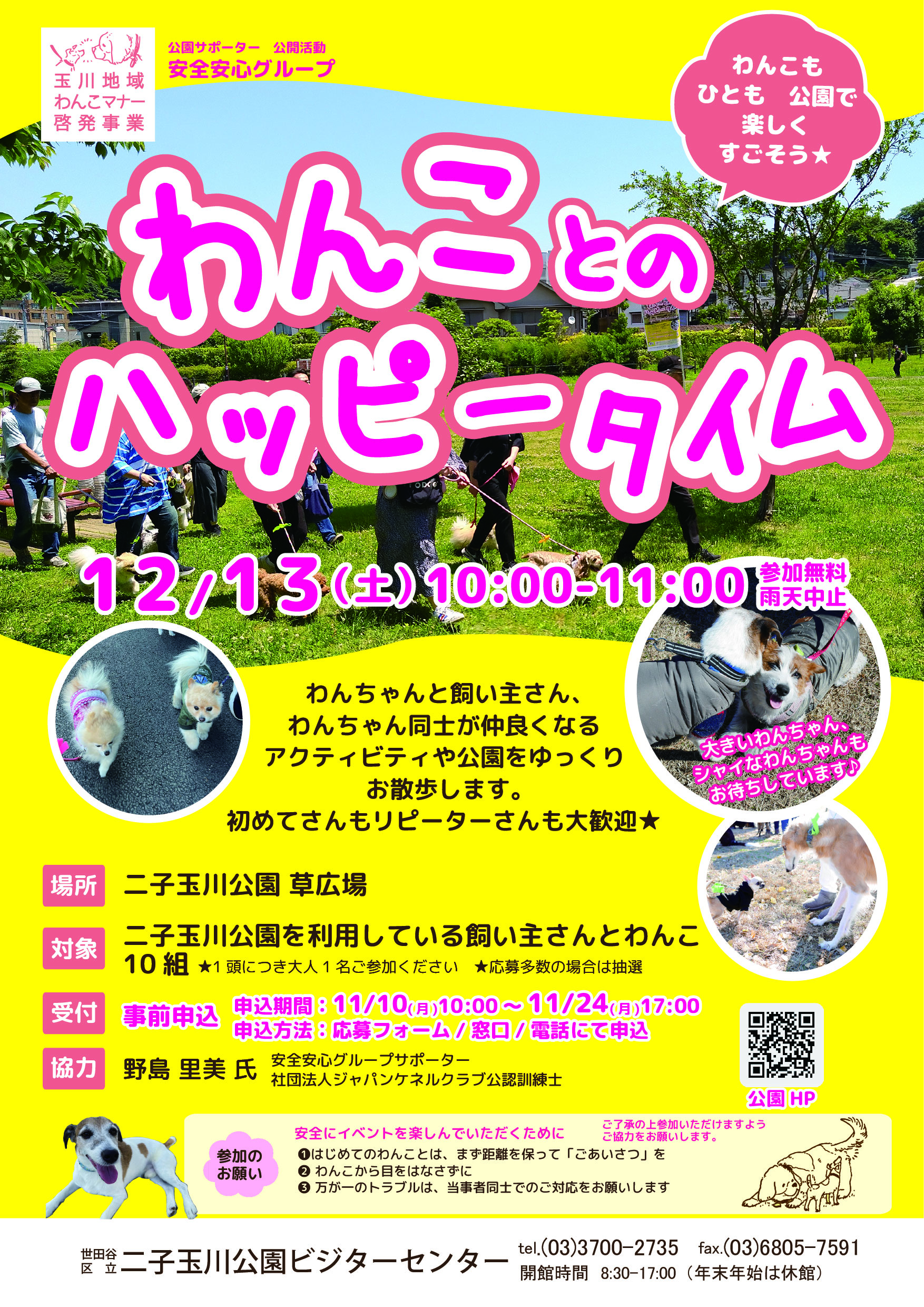 2025年12月13日(土)10:00~11:00 ※雨天中止。前日午後にホームページでご案内します。 ※暑さ・寒さ対策(人・わんこともに飲み物、帽子等)を行ってご参加ください。