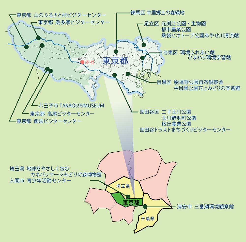 CESでは2025年度現在、都内を中心に19施設の運営業務、解説業務を行なっています。自然公園のみならず近年は都市公園での環境教育のニーズも高まっており、そうした施設の運営などにも多く関わっています。
