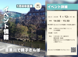 内 容:中目黒公園~中目黒駅周辺~目黒川船入場のルートで川沿いを散歩します。