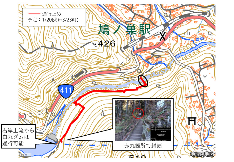 期間中は、鳩ノ巣小橋と鳩ノ巣小橋~白丸ダムまでの遊歩道が閉鎖されるため、迂回として国道411号を通行してください。上記区間以外の大多摩ウォーキングトレイルは、通常通り通行可能です。