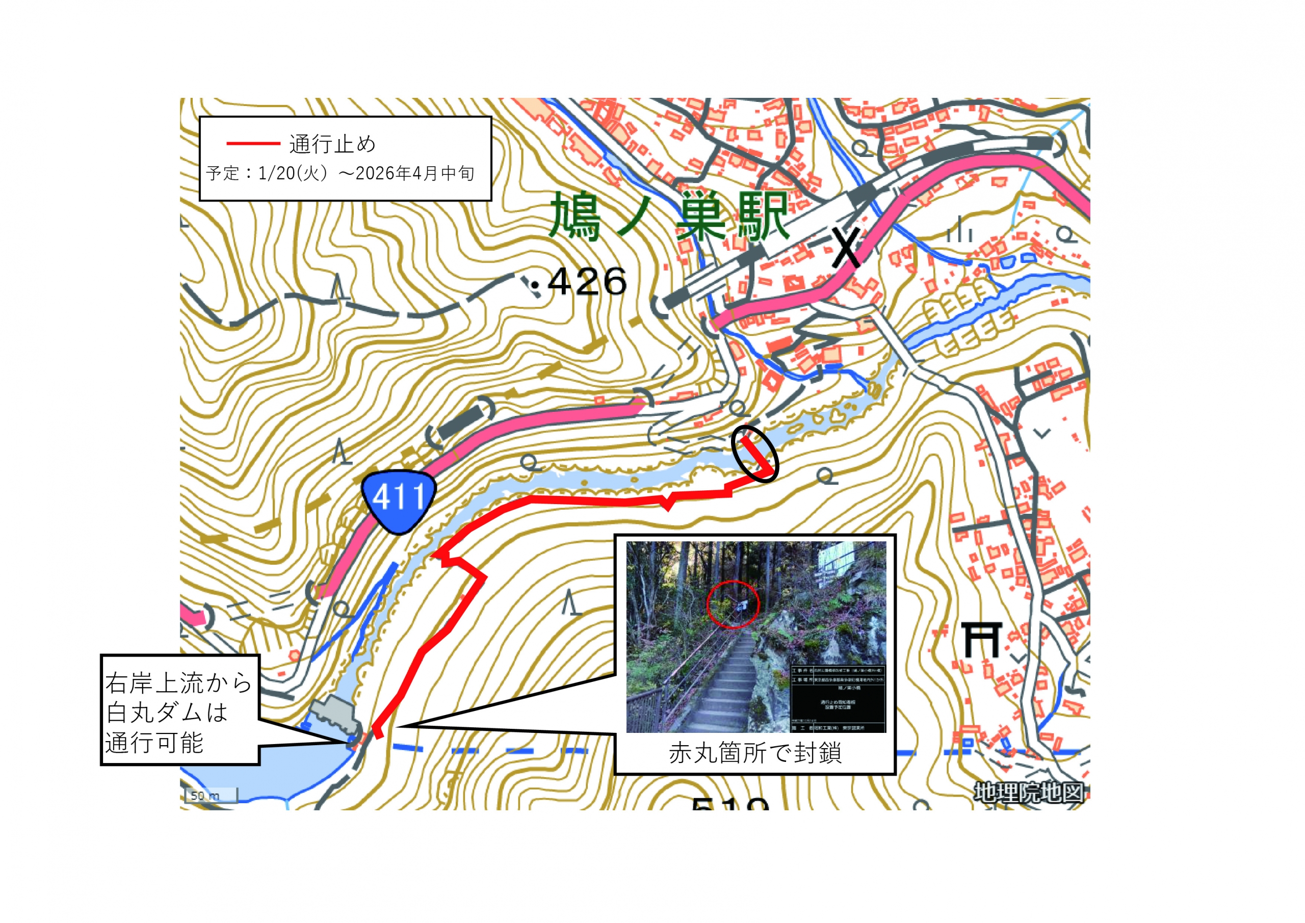 迂回路は国道411号です。白丸ダムの上は歩けます。 詳しくは、通行止め区間図をご確認ください。 |