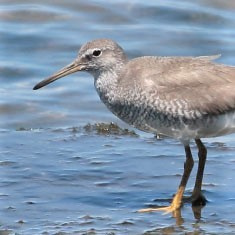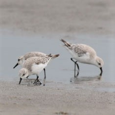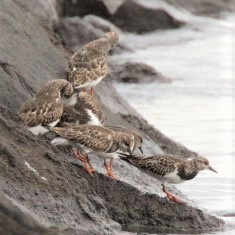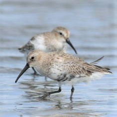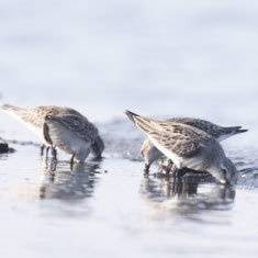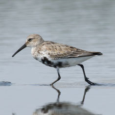 9月から翌5月にかけて旅鳥または冬鳥として見られるシギです。夏羽は腹面に黒斑があり背面は赤褐色。冬羽は灰褐色でミユビシギによく似ていますが、本種はわずかに嘴が長く下にカーブします。群れで現れますが、近年その数を減らしています。