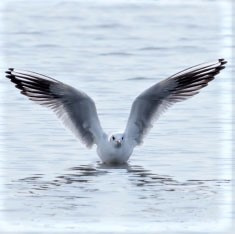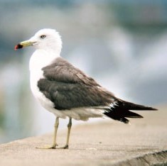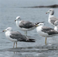 冬鳥として沿岸部などに渡来し、三番瀬でもよく見られます。全長約60㎝と大型のカモメです。嘴全体は黄色ですが、下嘴前方に赤い斑があるのが特徴です。冬羽は頭部から胸部にかけて灰色の斑点があります。