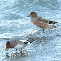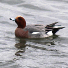 10月から4月にかけて三番瀬に飛来するカモの仲間です。雄は赤みの強い茶色で頭部の正面に黄土色の模様があるのが特徴です。嘴は全体が灰色で先端が黒いです。草食性が強く、護岸などに生えた藻類を食べます。