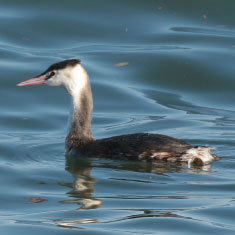 主に11月から4月にかけて観察できる大型のカイツブリ。夏は名前にあるように冠状の飾り羽があるが、冬はあまり発達せず、冠羽も短くなる。潜水が得意で30秒以上も水中で狩りをし、主に小魚を食べます。
