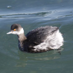 主に11月から4月にかけて観察できます。冬は頭頂が黒く顔の下部分は白いのが特徴です。また眼は鮮やかなオレンジ色。他のカイツブリの仲間と同じく、水中に潜ることが得意です。潜水しながら小魚や貝類、甲殻類などを食べます。