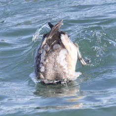 10月から3月にかけて三番瀬に飛来するカモの仲間です。名前のとおりオスの尾が長いことが特徴です。オスには首に白い線が入ります。植物食の強い雑食で、護岸の海藻や海底の貝を逆立ちになって泳ぎながら食べます。