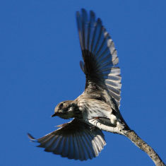 全長20 cmの肉食性の鳥です。先端が下に曲がった嘴を持ち、昆虫やトカゲ、小鳥などを捕食します。とらえた獲物を木の枝にさす「はやにえ」をすることで有名です。公園などの周囲を見渡せるような場所に止まっている姿をよく見かけます。