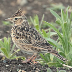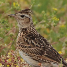 全長17 cmで、春に空高くさえずりながら飛び回る姿をよく見かけます。石や杭の上でも、頭頂部の冠羽を立てながらさえずる姿も観察できます。開けた野原や畑に生息していますが、生息地の減少により近年数を減らしている野鳥です。