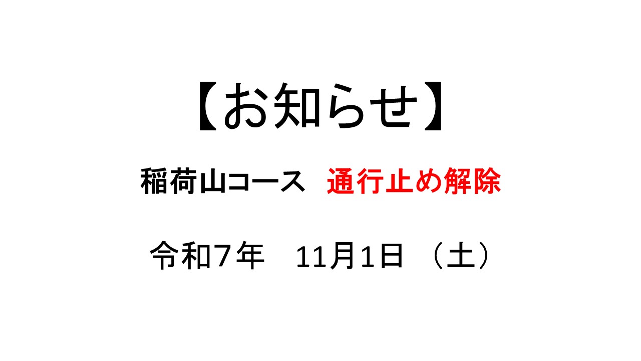 2025年11月1日 【お知らせ】稲荷山コース 通行止め解除 稲荷山コースにおいて、コース沿いに多数の危険木が確認されたため、令和7年2月19日(水)より長期間通行止めとさせていただいておりました。 この度、危険木の処理作業に目途が立ちましたため、稲荷山コースが令和7年11月1日(土)より通行可能となりました。 長きにわたる通行止めにより、皆様にはご不便をお掛け致しました。